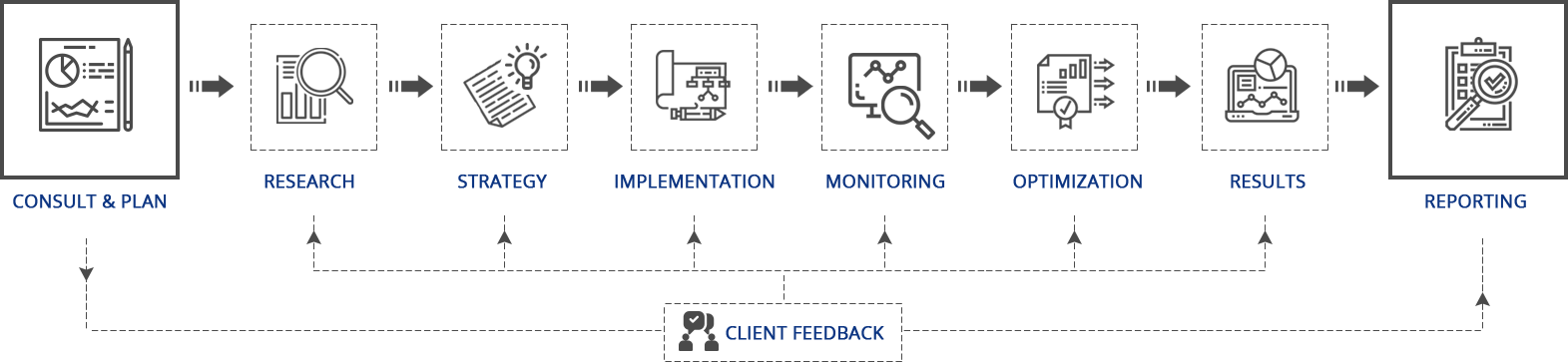 We create a very comprehensive and high-leverage strategy, that guides us in our entire SEO process. The process is comprised of a series of six activities that are monitored time to time.